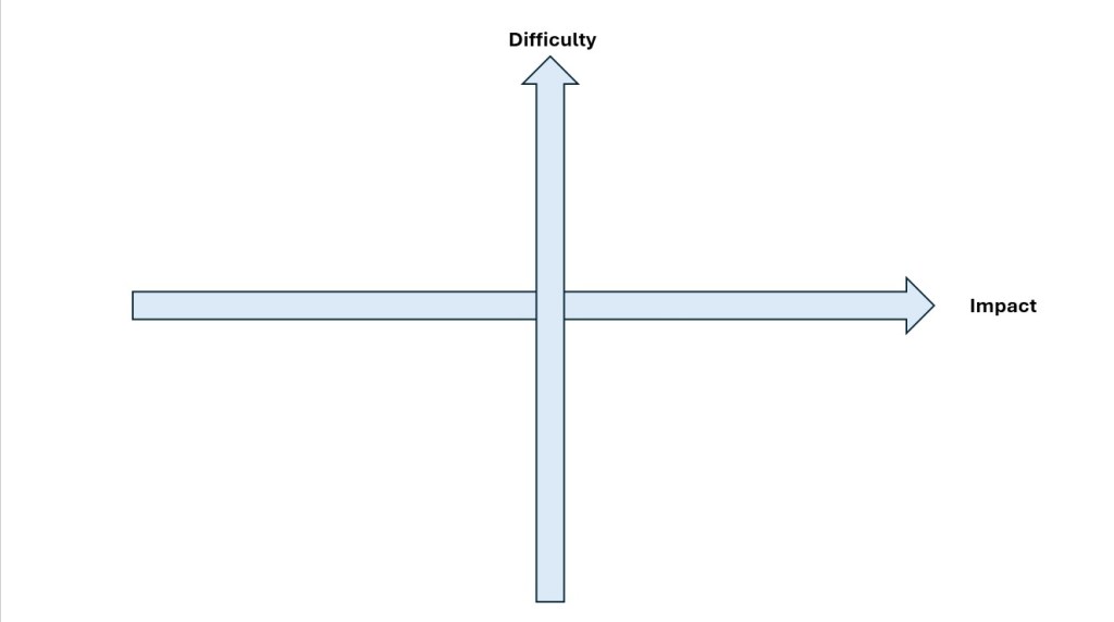 If you draw the dimensions out on a piece of paper, you have four boxes: lower impact and more difficult to achieve; lower impact and easier to achieve; higher impact and difficult to achieve, and higher impact and easier to achieve. Estimating where problems lie on this spectrum gives you a structure to decide what you want to tackle first.